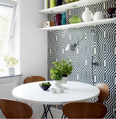 Just look at this home office with black and white wall covering e mixing vintage furniture